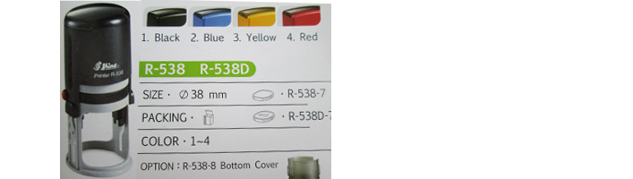 Mộc dấu tròn Shiny R538 có đường kính 38mm, sử dụng tăm bông R538-7, có bốn màu đen, xanh, vàng , đỏ.
